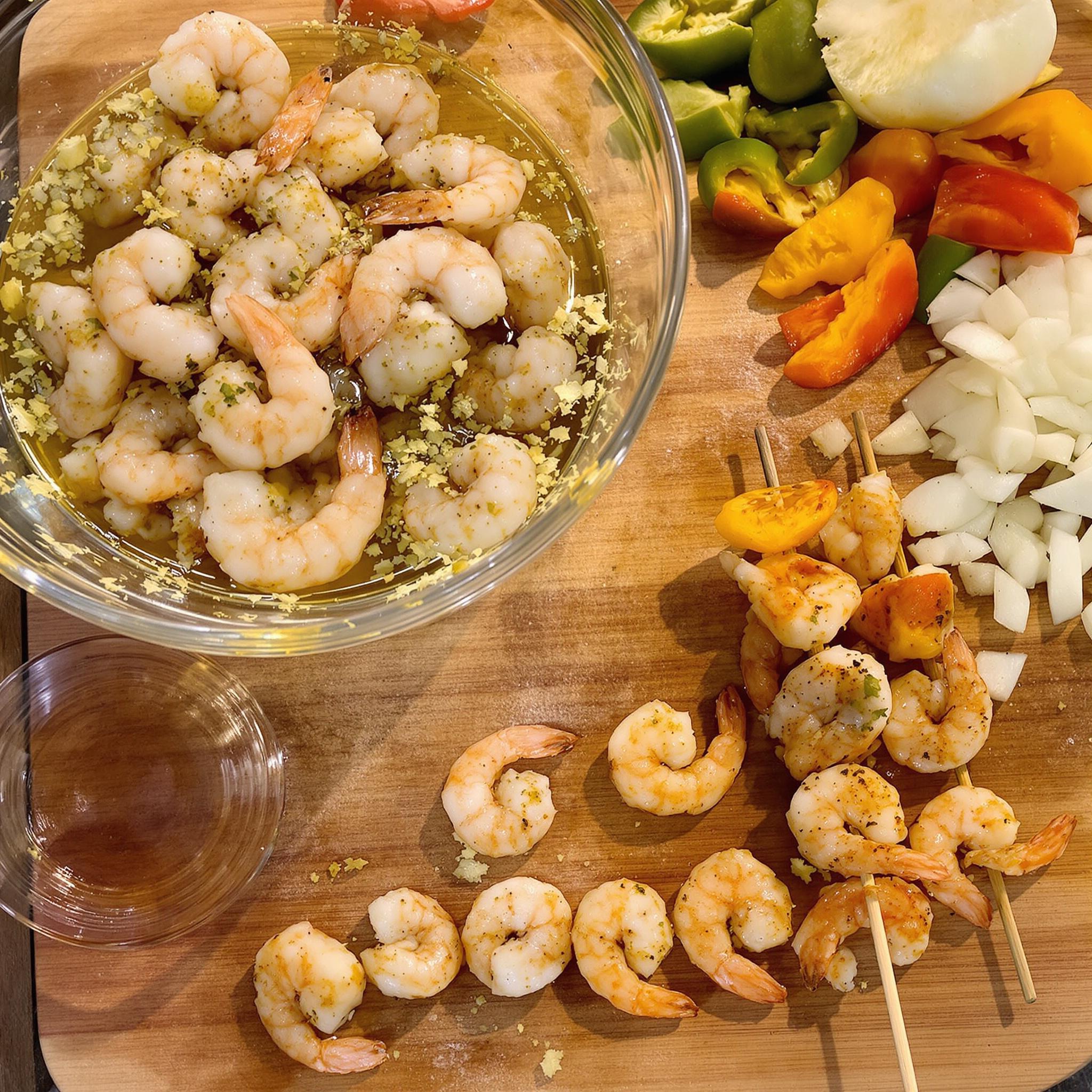 Om plakkerige garnalen te voorkomen, dep ze droog met keukenpapier voordat je ze marineert. En voor soepel rijgen, doe de spiesjes even in olie.