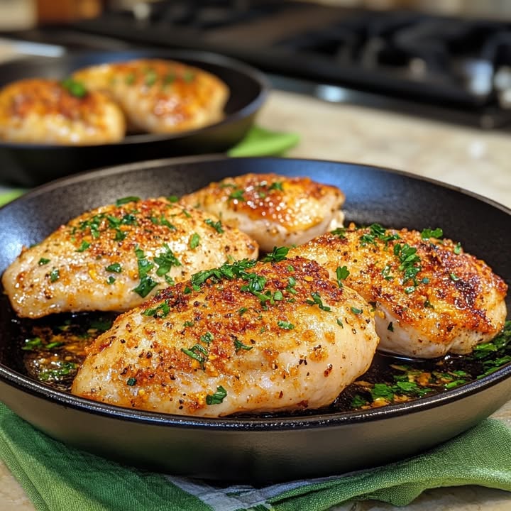 Tijd voor de finale! Verspreid de fijngehakte verse peterselie rijkelijk over de kippenfilets. Die frisse groene kleur en smaak maken het compleet. Serveer direct, terwijl de kip nog warm en vol aroma is.
