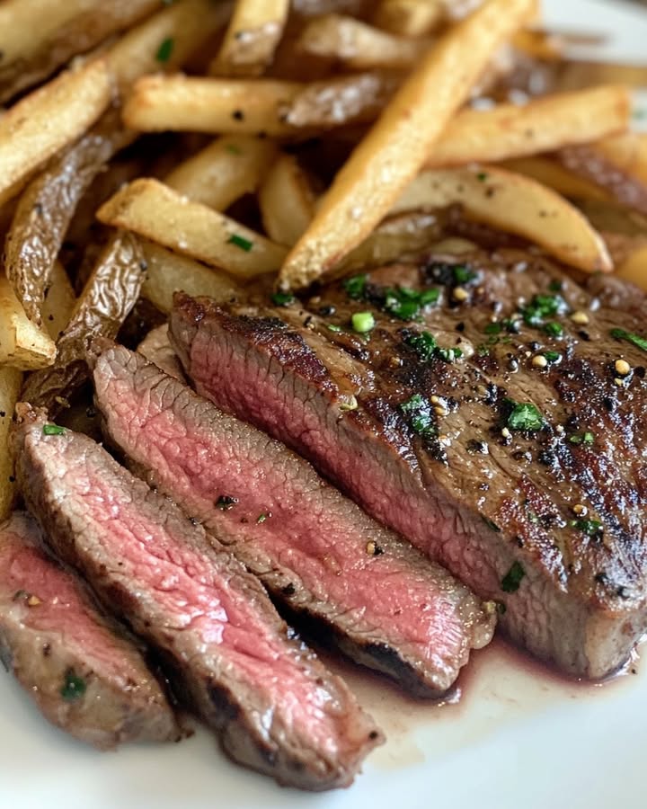 Er is weinig dat zo’n gevoel van pure voldoening geeft als het perfecte stuk vlees. De geur van een ribeye steak die tegen heet boter sizzelt. Het gouden kleurtje van zelfgemaakte friet. De zoete, diepe smaak van langzaam gestoofde uitjes. Dit is geen gewoon avondmaal. Dit is een viering. Een knuffel op een bord voor jezelf en voor iemand die je heel dierbaar is. Ik maak dit gerecht al jaren voor verjaardagen, huis-warm-feesten en die vrijdagavonden waarop je jezelf gewoon wilt verwennen. Het is mijn absolute go-to voor een geslaagde, luxe maaltijd zonder urenlang in de keuken te staan. Vandaag neem ik je stap voor stap mee naar dat moment van gelukzaligheid.