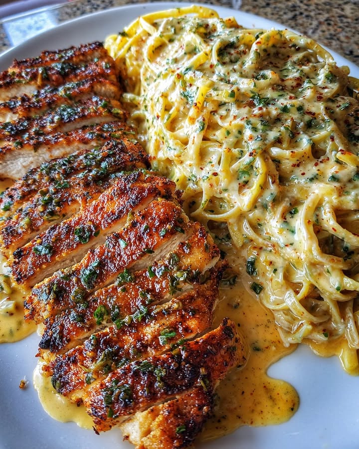 Hoe je het opschept maakt het eten nog leuker. Gebruik een tang om een mooie nest linguine op elk bord te leggen. Rangschik de kipreepjes er sierlijk bovenop. Haal met een lepel wat saus uit de pan en schenk die extra over de pasta. Garneer met een flinke hand verse, groene peterselie en een laatste wolkje Parmezaan. Serveer met een simpele groene salade met een licht citroendressing om de romigheid te balanceren. En stel een pepermolen en een schaaltje extra rode pepervlokken op tafel, zodat iedereen zijn eigen niveau pittigheid kan kiezen.