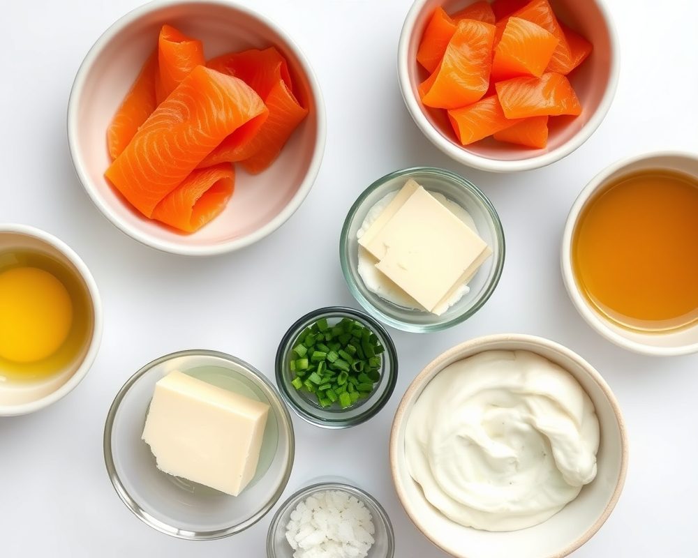 - Voeg de gebakken ui, fijngesneden bieslook en stukjes gerookte zalm toe. Breng op smaak met zout en peper.